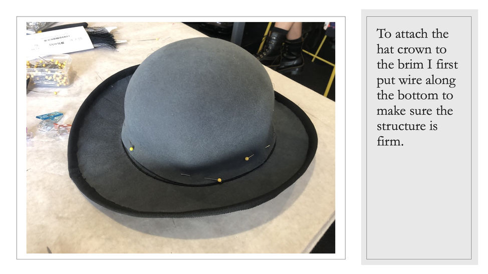 I learned how to create a hat as milliners would do with a hat block. I made a felt hat from scratch using this method. I got to work with new materials like wire joiners, grossgrain, millinery needles, and the particular milliner's wool felt. It is amazing how you can shape the felt so much by steaming it. Pinning it to the hat block so it is secure in the shape you want takes some effort though. I sewed the hat pieces together securely in neat stitches. I finished by covering the edges in a nice grossgrain ribbon. For an extra something on top I crafted two flowers out of felt The project made me appreciate the time and effort of milliners in making hats. You can scroll through all my steps of the process in the slides above.