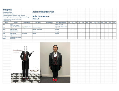 'Suspect: A Game of Murder was an interactive improve mystery show I wardrobe managed at SCAD. It was set in the 1920's, the story and characters are influenced by audience participation, and the lead actors switches between playing the victim and detective. My tasks included creating wardrobe paperwork, organizing laundry, steaming garments, and assisting actors in dressing and quick changes. I led a wardrobe crew in taking care of the garments, laundry spraying, hand-washing, and machine washing specific pieces.